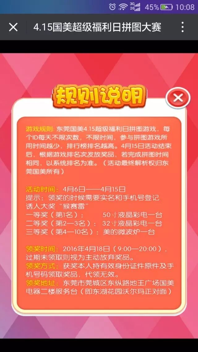 最近一款“华容道”游戏也受到了东莞市民的热搜,微信朋友圈各种疯狂转发!什么游戏能有如此大的吸引力?原来是4.15国美超级福利拼图大赛,排名也是分分钟不断刷新中,小编觉得玩游戏是其次,重要的是还有丰富奖品拿啊!