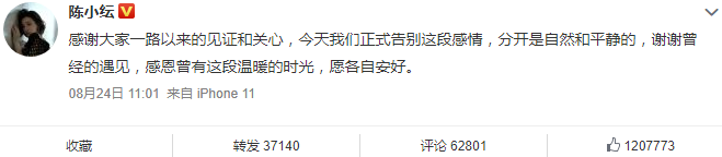 Chen Xiaoyun writes, “Thank you for everyone’s concern and attention, today, we officially bid this relationship goodbye. Our parting is natural and peaceful. Thankful for having once met and for having the beautiful moments. Hope that we can both be well.