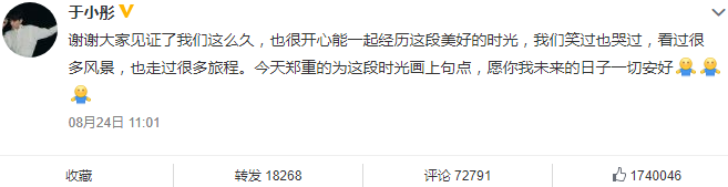 于小彤则写道:“我们笑过也哭过,看过很多风景,也走过很多旅程。今天郑重的为这段时光画上句点,愿你我未来的日子一切安好。”