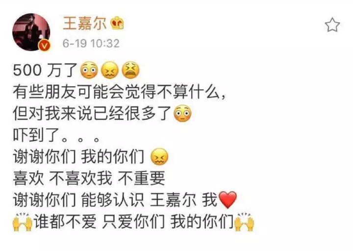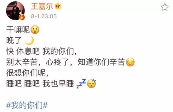 面对这样的一群人,他发微博感激粉丝们的支持和付出堪称是日常了。微博除了宣传自己的综艺,就是和粉丝的互动,他亲切的将粉丝称为“我的你们”。然后每天腻腻歪歪的跟粉丝告白、感激,然后叮嘱粉丝要照顾身体,注意休息。