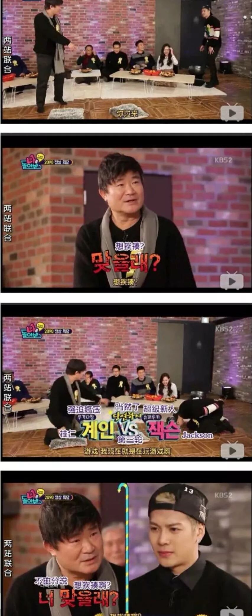 在一档《回头看我》韩综里,王嘉尔还被韩国艺人扇耳光,前辈一直问“是不是想挨揍啊?”这样挑衅的话,王嘉尔作为新人,只能出来不断道歉,但还是被打了。最后还是身边的主持人看不下去了,站出来劝说调解,这事才过去。