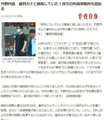 不过对于竹野内丰承认与仓科加奈分手,不少网友感叹又一个女星的想结婚,而男星却没想法,之前纪凌尘阚清子、倪妮井柏然、马思纯欧豪差不多都是这样!!