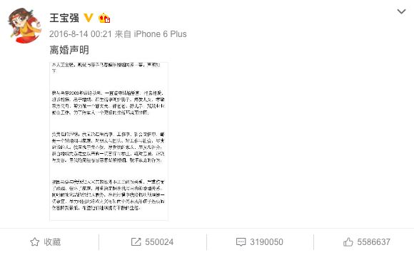 真正能让王宝强乐开了花的,或许还是这次胜诉在感情层面上的补偿。2016年8月14日凌晨,王宝强通过微博发布了离婚声明,直指妻子马蓉出轨经纪人宋喆,表态将与马蓉离婚并解除宋喆经纪人职务。这条微博迅速爆掉了热搜榜,据新浪微博数据显示,14日当天“王宝强离婚”的话题阅读量超过10亿次。一周后,该话题阅读量达到了93.5亿。与此相伴的是,网络上先后出现了反斥王宝强出轨在先的声音,马蓉联合宋喆父母转移财产等真假难辨的消息。