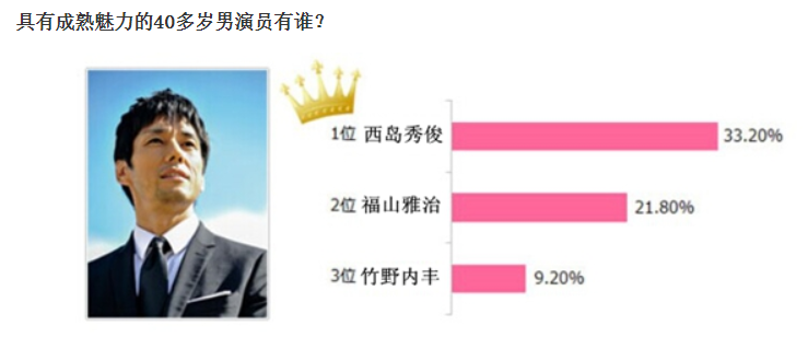 几年前,曾有日本媒体做过“具有魅力的40多岁男演员”的调查,西岛秀俊的得票甚至高于福山雅治和竹野内丰。