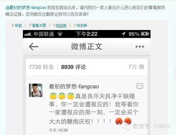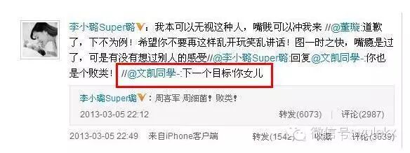 2013年3月5日,初为人母李小璐发微博表达了自己对长春婴儿小皓博遇害的悲痛之情,不料却有网友在评论中写到“下一个目标是你的女儿”,这句评论让李小璐非常愤怒,转发并以“你也是个败类”回击!