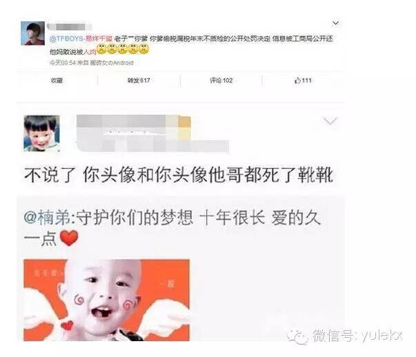 2015年4月7日,有网友爆料称因为TFBOYS成员的粉丝闹矛盾,某成员的粉丝迁怒于易烊千玺,在微博上人肉出易烊千玺的父母双亲,甚至具体到户口和车牌,同时,还将其易烊千玺两岁的弟弟拿出来诅咒。