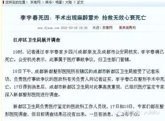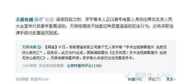 2012年3月,一条谣传“李宇春因手术出现麻醉意外抢救无效心衰死亡”的消息在网上流传,后证实是网友邹某恶意造谣,将2011年的一则旧闻标题进行了张冠李戴PS合成,对此,李宇春的经纪公司将造谣者告上法庭,要求判令邹某公开赔礼道歉、消除影响,并支付精神损害赔偿金10万元等。