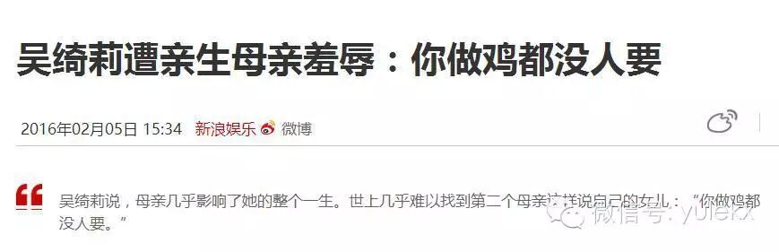 近日,某真人秀制片人在微博上发长文细说参加他节目的嘉宾吴绮莉与母亲的相处关系,他在文中透露,吴妈妈性格古怪,经常会半夜跑进吴绮莉房间,冲她发脾气,拿菜刀逼着她去找孩子她爹(指成龙),气急的时候拿刀到处乱砍,把厨房的桌子都剁烂,甚至从小就诅咒吴绮莉:“你做鸡都没人要。”对此,一床情书觉得世上恐怕也难以找到第二个会这样说自己女儿的母亲了吧?