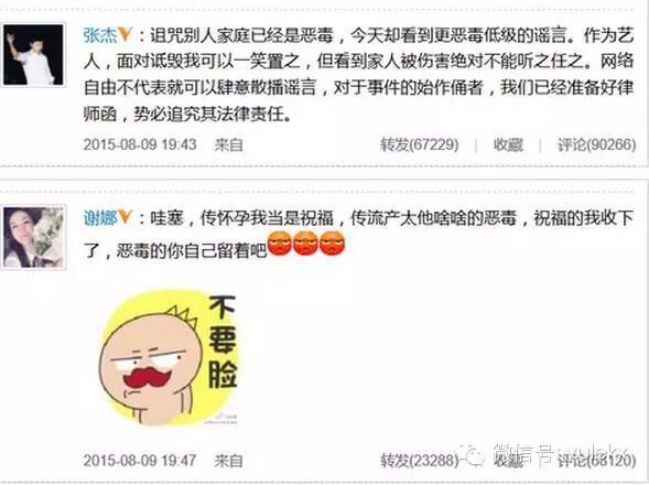 2015年8月,#谢娜流产#被刷上微博话题榜,随后谢娜发文称:“哇,传怀孕我当是祝福,传流产太他啥啥的恶毒,祝福的我收下了,恶毒的你自己留着吧。”并配了一张“不要脸”的图片。张杰也发文称:“诅咒别人家庭已经是恶毒,今天却看到更恶毒低级的谣言~~我们已经准备好律师函,势必追究其法律责任。”