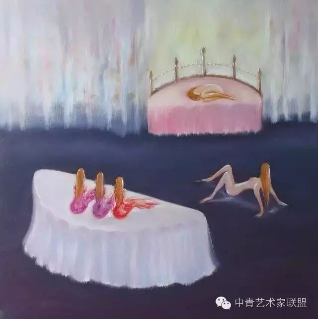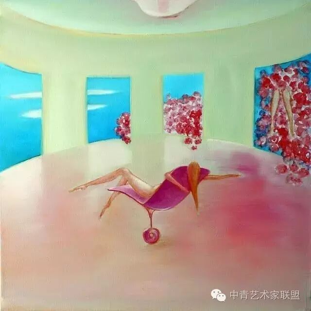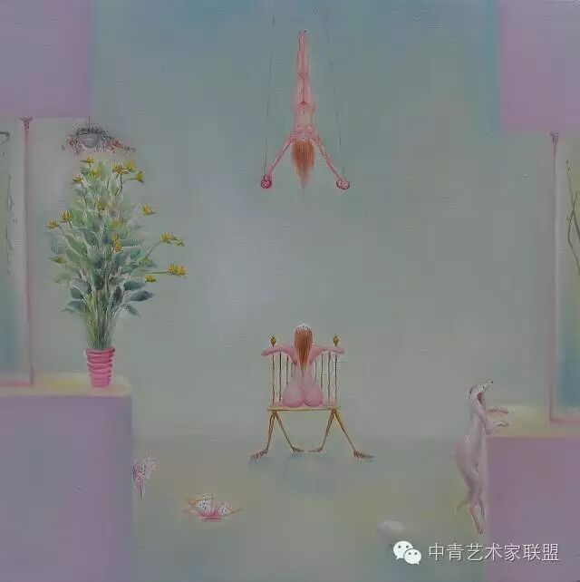 这是一组由女人作为主题的画作。依然是清新淡雅的格调,依然保持着唯美的色彩和笔触。每一幅画作中的女人都是纤细而小巧,赤条条无拘无束像精灵一样出现在各种场景中。如梦似幻。乍一看那些小巧的精灵们只是简单的生活在画家给她们构筑的伊甸园中过着或潇洒、或寂寞、或疯狂、或简单、或快乐、或痛苦、或恐怖、或淫荡等等你想到或想不到的生活中,向人们诉说着女人们玩偶般的命运与羁绊。然而,细细品来,那一幅幅画作所表现的并非那么简单。那淡淡的色彩中浓墨重彩的涂满了欲望。令人振聋发聩,撼动灵魂。精灵们缥缈于云端,云端却如同一座色彩斑斓的孤岛,漂浮在空溟的宇宙不知何去何从。更令人难忘的是许许多多的精灵被融于音乐,她们在各种乐曲中陶醉、哭泣、流连。让人有那种丢不开,舍不下的无奈,总之,就是整个画面充斥着一种无以言表的情绪。音乐是可以令情感自由飞翔的形式,相信画家醉心于这样的表现形式应该有他的道理。在画家构筑的城市中,精灵们所表现出的游离、彷徨,舞蹈出城市生活的艰巨和喧嚣。可以想象,在狭窄的城市间觅生活是多么的艰难,能有一片天地是要付出怎样的代价?然而,城市梦是当今社会每一个普通人都向往的梦,在这个由钢筋水泥构筑的大千世界里,什么样的梦都可能成为一个美丽的肥皂泡。现实毕竟不是童话,梦一般的童话世界在现实生活中更多的是无奈和挣扎。