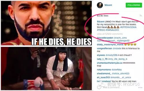 最经典的莫过于上面这张meme, 借Drake干Meek,讽刺说:如果Meek死了,那就死了。(没人留恋他)