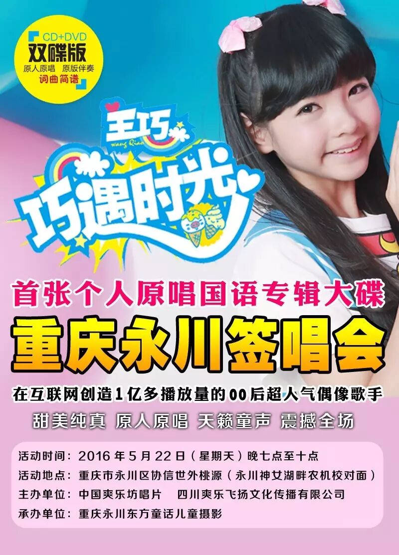 5月22日晚,其演唱视频在网络中创造了两亿多次播放量的“国民小女神”王巧携个人国语新专辑大碟《巧遇时光》现身重庆永川,举办专辑签唱会。现场不但与歌迷们亲切互动,更倾情献唱了多首经典歌曲,引得全场大合唱。当晚签唱会人气爆棚,现场被挤得水泄不通,场面几近失控,来自全国各地的歌迷朋友们和王巧一起分享了近三个小时的音乐盛宴。