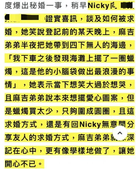 据Nicky回忆,在登记的前一天晚上,麻吉弟弟带着她到无人的海边,海滩上摆了一圈蜡烛。这个求婚方式是Nicky朋友曾经做过的,她无意间分享给了麻吉弟弟,没想到对方一直牢记在心,还策划出一模一样的求婚。