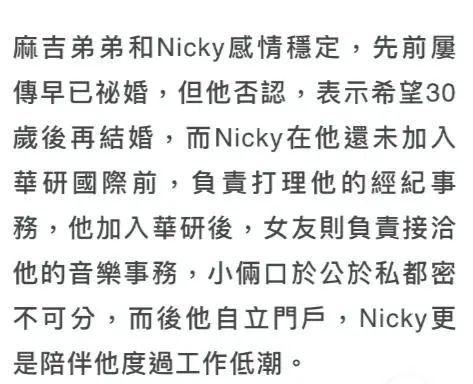 麻吉弟弟和Nicky虽然一直没有公开结婚的消息,在大众眼里他们早已经是焦不离孟。在麻吉弟弟没有找到经纪公司之前,Nicky是他的经纪人,负责打理经纪事务。