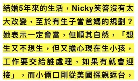 也因为这个原因,Nicky一直在犹豫要不要生小孩,担心有了孩子后,麻吉弟弟的工作没人处理,一直在为男方着想。