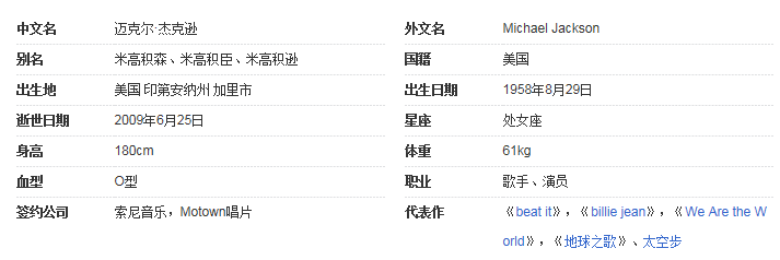 迈克尔·杰克逊(Michael Jackson),1958年08月29日在美国印第安纳州加里市出生,美国歌手、词曲创作人、舞蹈家、慈善家、音乐家、人道主义者、和平主义者、慈善机构创办人。1982年12月,杰克逊音乐生涯最畅销的专辑《Thriller》发行。1987年9月,杰克逊展开个人首次全球巡演。通过舞台和视频的表演,普及了像机械舞和太空步等舞蹈技术。杰克逊一生中两次入选的摇滚名人堂,获得了13个格莱美奖和26个全美音乐奖。2000年吉尼斯世界纪录大全里认证他资助过39个慈善机构。2009年5月6月25日,他因为急性丙泊酚和苯二氮平类药物中毒导致心脏骤停逝世。洛杉矶法医裁定这是一宗凶杀案,他的私人医生康拉德·莫里被判定过失杀人罪。2010年,迈克尔·杰克逊被授予格莱美终生成就奖。