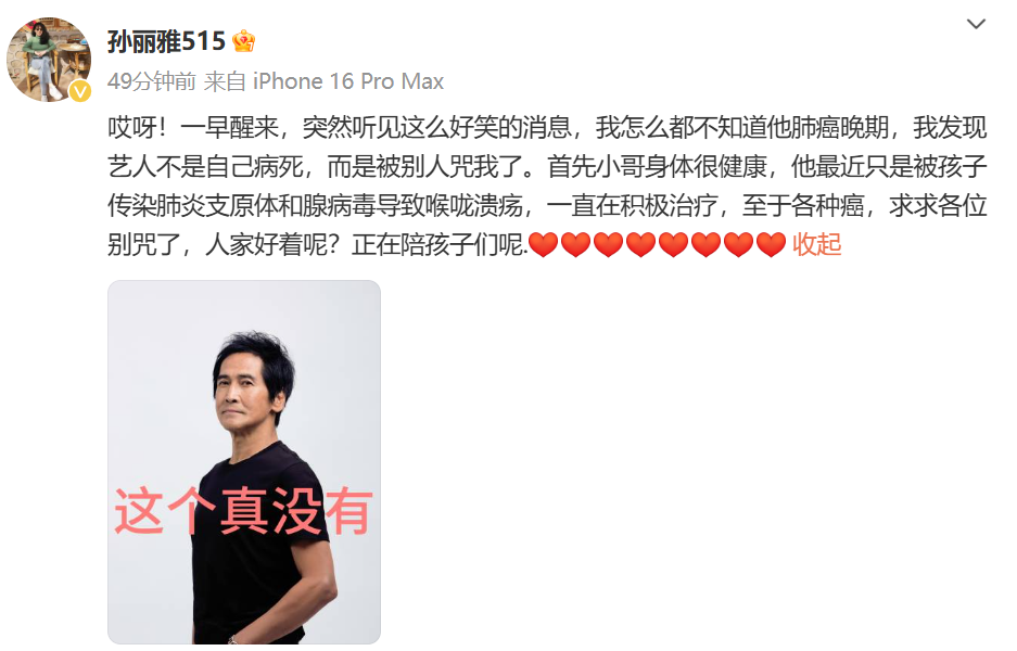 今天下午,齐秦妻子孙丽雅在微博发文否认上述传闻。