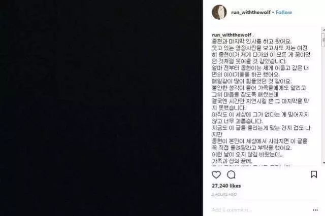 钟铉18日在结束自己的生命之前,曾传讯息给姐姐,“一直以来都很辛苦,送我走吧!希望能对我说声辛苦了,这是最后的问候。”