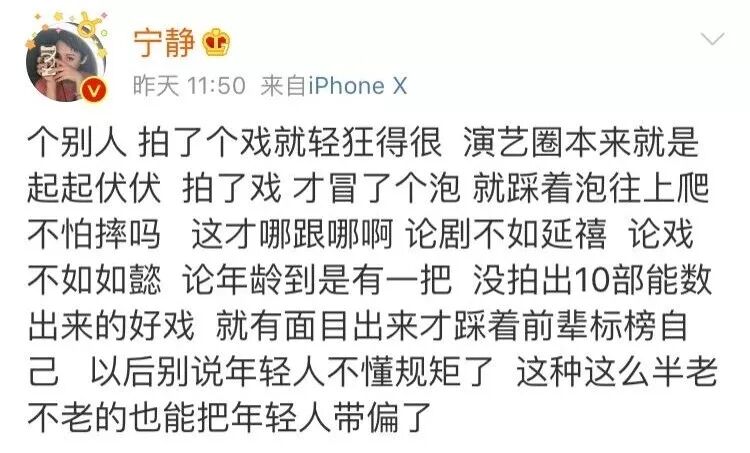 性格一向耿直的宁静昨天发了个微博,疯狂diss某位女艺人,但因为没指名道姓,这可把网友折腾坏了,好一顿猜这位“半老不老”的到底是谁?