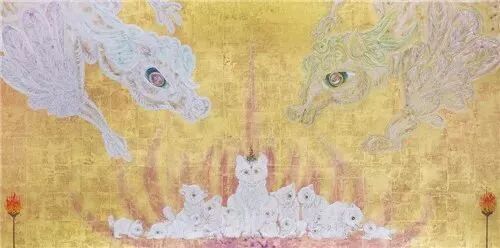 可能是随着年龄的增长,小松美羽的艺术世界不再仅限于黑白。从她的画作中,同样也感受到了她人生态度的转变。明亮粗犷的线条,对比鲜明的色彩,杂而不乱。而与此产生强烈对比的,本该虎虎生风庄重威严的神兽,在她的笔下反而透出了一股萌萌的气息。小编认为,既然神明都是为了保佑我们而存在的,自然也一定有着可爱的面容。
