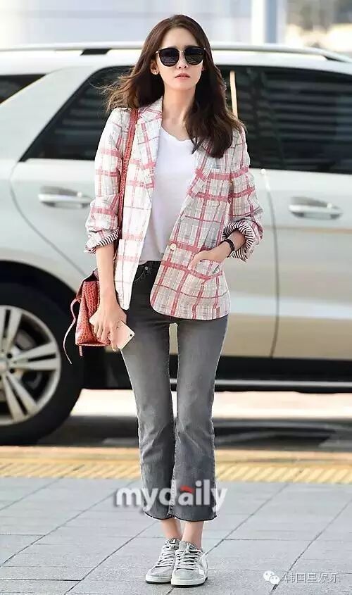 粉色格子休闲西装+喇叭牛仔裤+运动鞋,既有淑女气质,又混合了休闲帅气的boy 风,眼镜的搭配更加增加了气场。