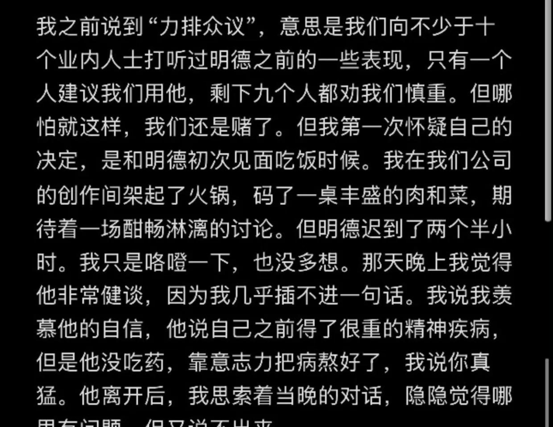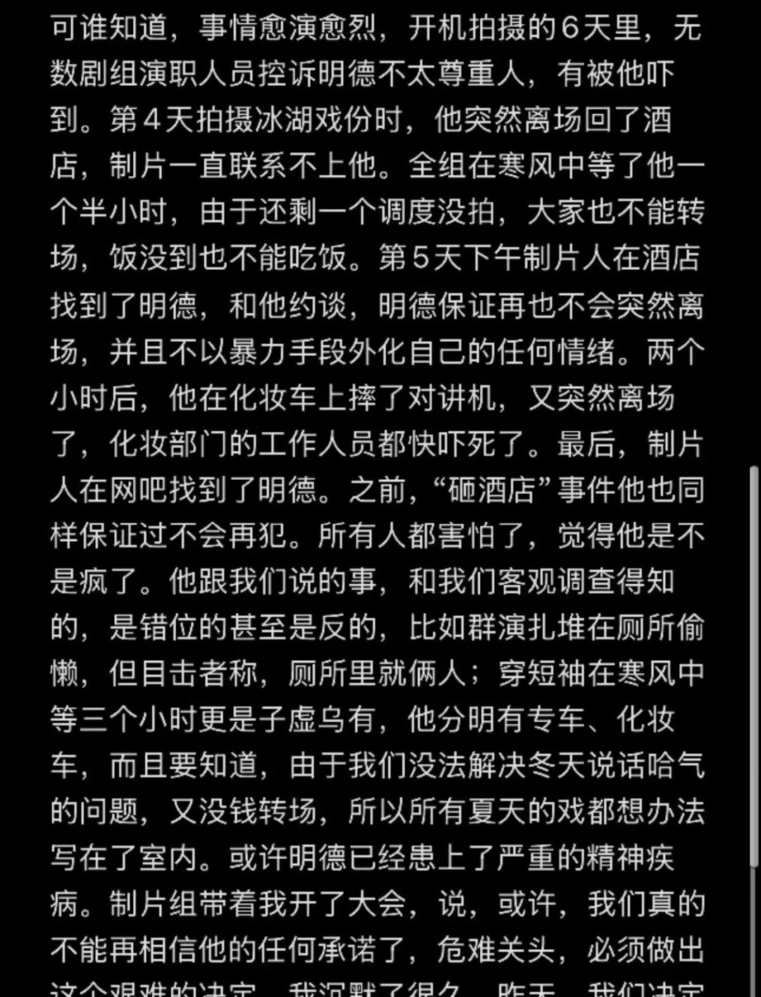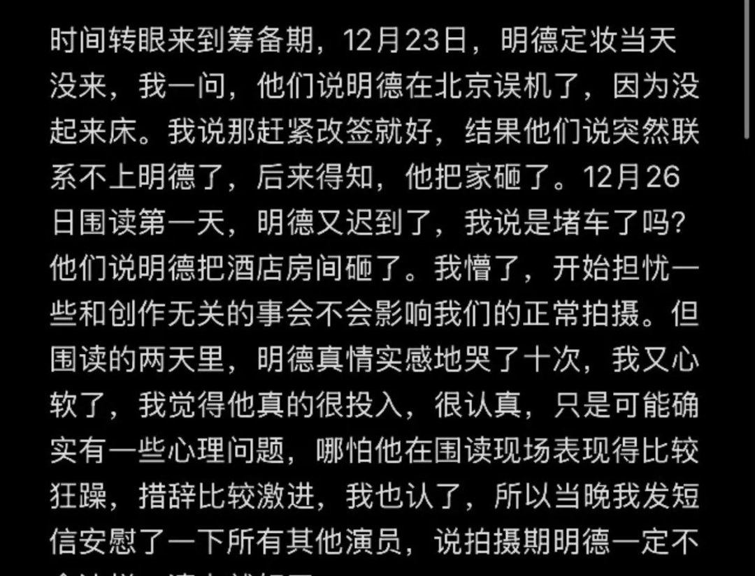 马天宇工作室的声明迅速打脸,直言“从未因个人原因让其他演员等待”,并指责李明德多次缺席拍摄、情绪失控,甚至“暴力砸坏酒店物品”。随后,导演“鹤唳云端”更是一篇“长文实锤”,揭露李明德迟到、发脾气、毁坏公物等行为,甚至暗示他有“精神疾病”。一时间,李明德“孤勇者”的形象瞬间崩塌。