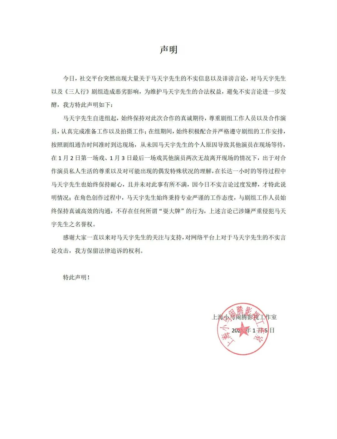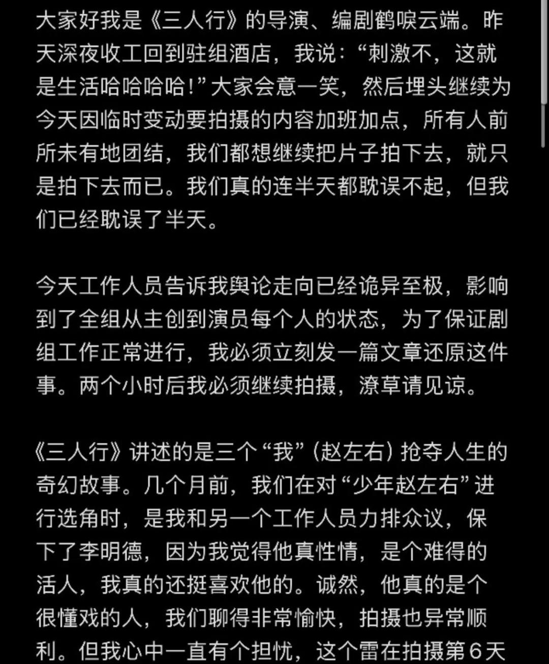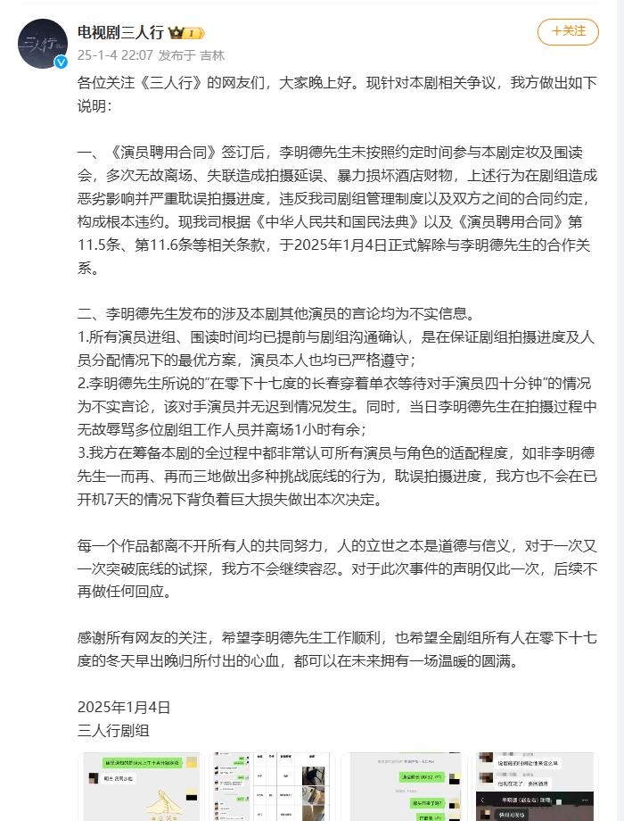 再看看《三人行》剧组的表现,简直堪称“火上浇油”。剧方的声明不仅力挺马天宇,还对李明德进行了全面指责:迟到、不配合拍摄、损坏公物、情绪失控……更有意思的是,导演直接爆料称,“全组10位业内人士,只有1位建议剧组用李明德”,言外之意就是他是“被力排众议选上的”。但网友对此并不买账,纷纷质问:“既然一开始就知道他这么多问题,为什么还要用他?为什么等到事件闹大后,才开始揭短?”
