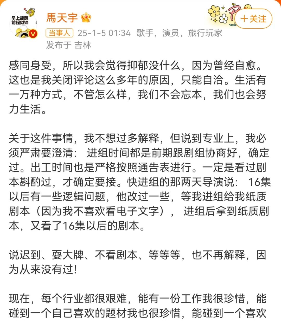 马天宇的回应同样耐人寻味。他在凌晨发文,提到“请多多关注抑郁患者以及狂躁患者”,随后秒删。这条动态不仅没能澄清自己,反而引发更多争议。网友认为,他用“抑郁症”暗讽李明德,既显得情商堪忧,又让自己陷入舆论危机。而他的第二次长文回应,虽然强调自己凭实力与剧组协商,时间安排合情合理,但最终还是因为“纸质剧本”问题,让网友觉得他在“避重就轻”。