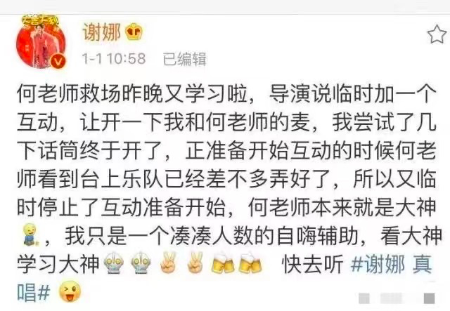 春晚犯错后,谢娜推脱自己只是凑凑人数的自嗨辅助。