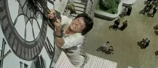 这个特殊的镜头,背后也有洪金宝在帮忙。成龙一连拍摄这个镜头几天,都只能拽着钟表,一直不敢往下跳。