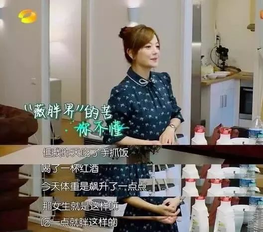 赵薇的画风也很萌,因为前一天晚上她吃了手抓饭,喝了红酒,导致第二天的体重上升。还很无辜的解释说,女生就是这样嘛。