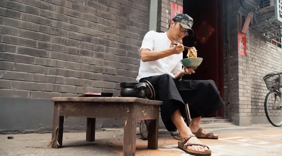 照片里谢霆锋打扮得非常接地气,和北京大爷无异,在胡同门口吃起了炸酱面。