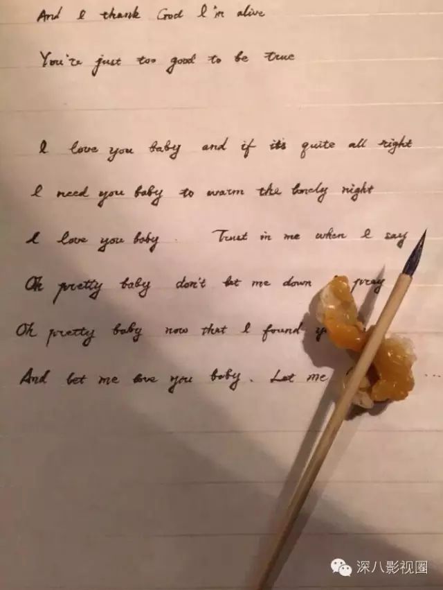这是他用毛笔抄写的《Can't Take My Eyes Off You》,