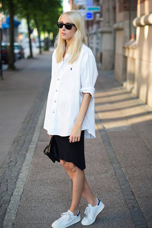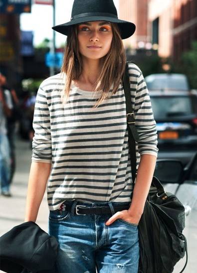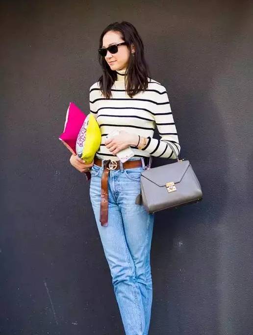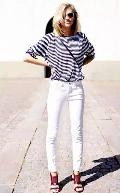 其实短款的条纹衫,也可以搭配高腰裙装,搭配伞裙,又会是不一样的感觉。