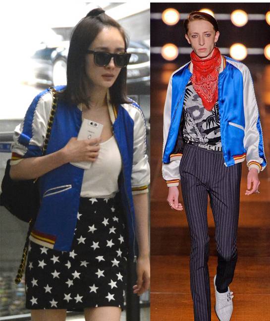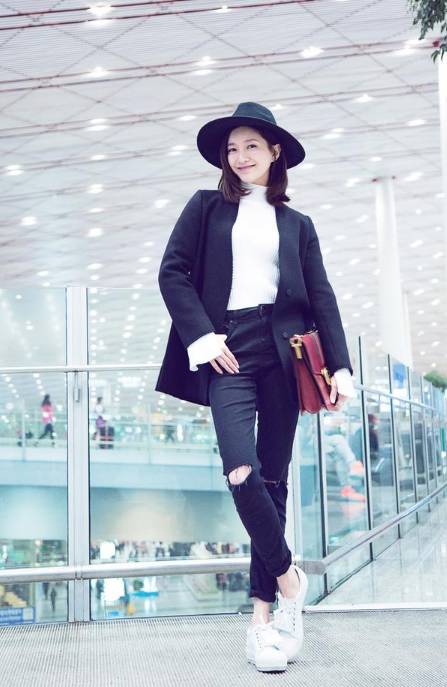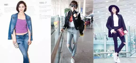 【袁姗姗:牛仔裤+牛仔外套+条纹君】