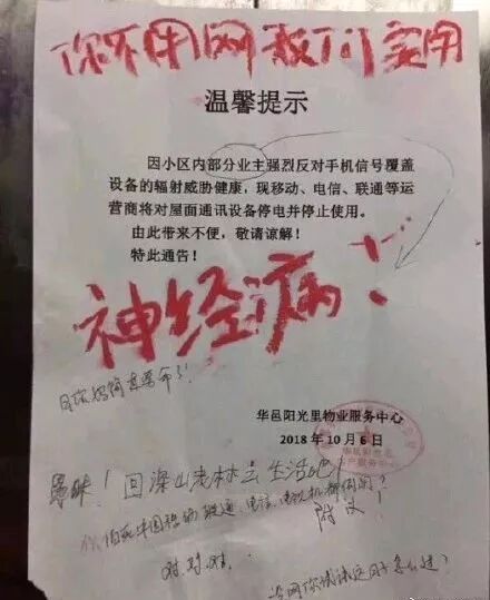 “因接到物业通知,小区有居民投诉在小区内的移动手机信号设备干扰了部分业主的正常生活,经沟通,解释无果,三大运营商将中断停止小区内所有移动手机信号设备的运行。”