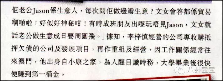 据悉,李梓慎经营的公司专门收购抵押欠债的公司及发展项目,再作重组及经营,因为工作关系经常要到澳门,他出身小康之家,大学毕业后就赚到了人生第一桶金。