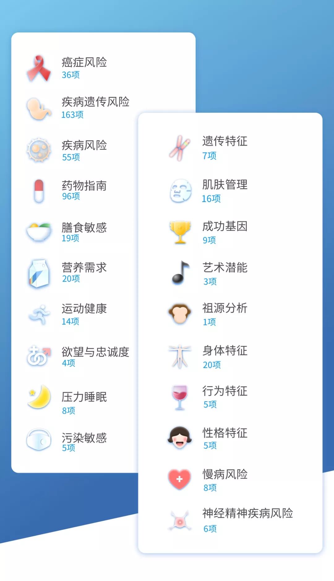 利用领先的WES全外显⼦组测序技术,深度、全面检测基因信息,提供数百项数据报告以帮助消费者优化膳食结构,提高运动机能,加深自我认知,科学有效用药,评估多种疾病及癌症的潜在风险。