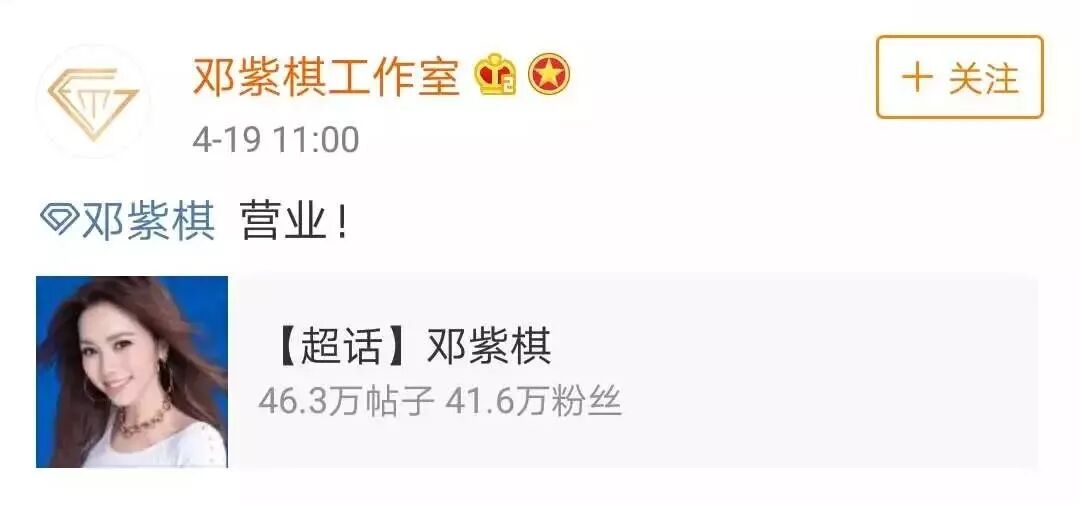 4月19日,邓紫棋工作室宣布:“营业”,随后邓紫棋本人也转发微博宣布个人工作室正式开通。