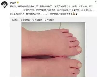 预产期将至的伊能静晒出脚的近照,脚肿的她被秦昊调侃脚像熊掌。