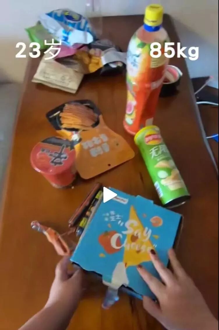 在23岁时,她85公斤,满桌子的零食和外卖。