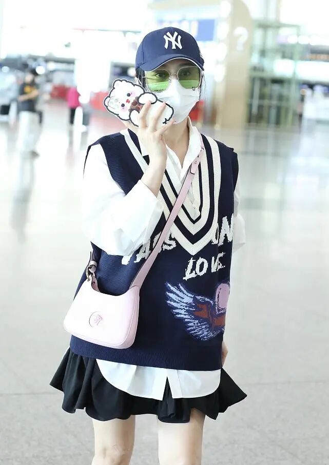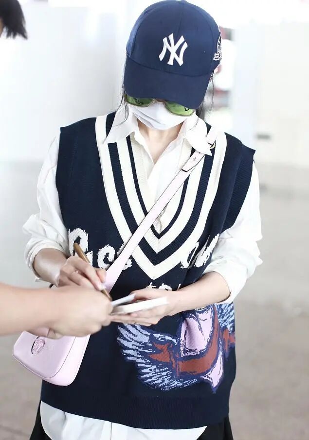 除却红毯上的惊艳造型,范冰冰的机场穿搭也十分出色。针织马甲内搭白衬衫,打造极具学院风的叠穿效果,条纹V领拉长脖颈线条,并增加了内搭衬衫的视觉面积,整体选择偏宽松的版型,起到了很好的遮肉显瘦效果。