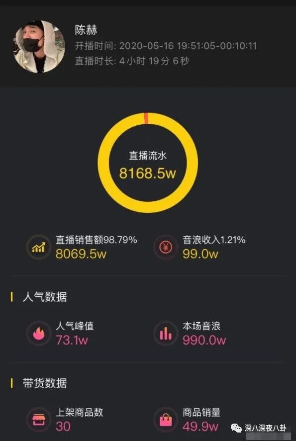 首先陈赫首次抖音直播带货,叽里呱啦4小时,一个晚上卖了30件货品,销售额8000万+,在数据上可以说是十分能打。