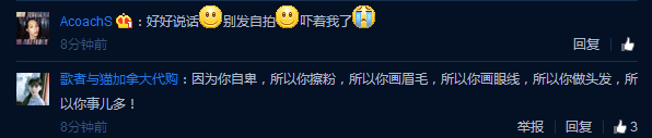 针对于小彤的烟熏妆网友们也有话说:因为你自卑,所以你擦粉,所以你画眉毛,所以你做头发...(不得不感叹网友们的智商简直太秒人啦!)