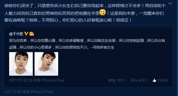 果不其然,于小彤的微博一经发出,所谓的“所有女生”就不乐意了: