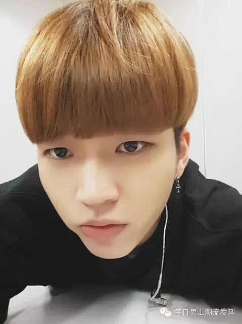 较为圆润的锅盖头,黄棕色头发很潮,南优铉演绎出来很有青春学生feel,还蛮可爱的。