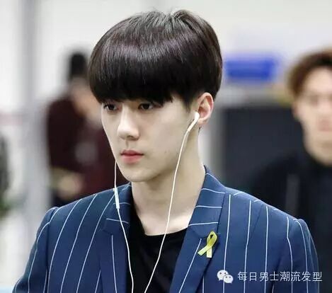 圆润又有点碎的锅盖头,发丝柔顺的感觉让吴世勋看起来犹如一个美男子,遮眉的长度感觉刚刚好,整个发型和他的瓜子脸很搭。