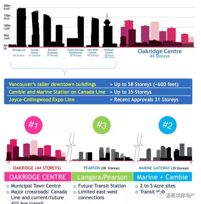 Oakridge Centre的重建计划将会大幅增加这一地区的人口密度。同时,坐拥目前已经十分繁忙的Canada Line沿线以及目前温哥华西区最大的改建计划Cambie走廊地带,Cambie路两侧很多公寓项目都值得期待,不管是已售的,还是未来将要入市的。以Oakridge Centre为中心,以下三个地区都是重要的公寓市场: