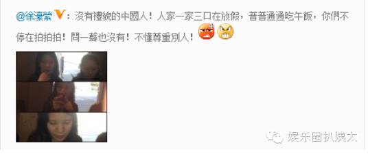 12年7月,徐濠萦声称自己和家人在外出用餐的时候遭遇偷拍,公开在微博怒斥对方为:“没有礼貌的中国人”,她并且还将拍摄者的照片放到这条微博上。