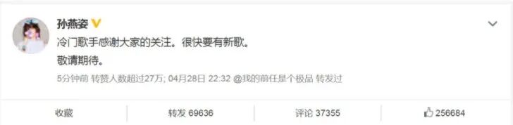 不过,孙燕姿对“冷门”评论看得很淡,她回复说:“冷门歌手感谢大家的关注。很快要有新歌。敬请关注。”